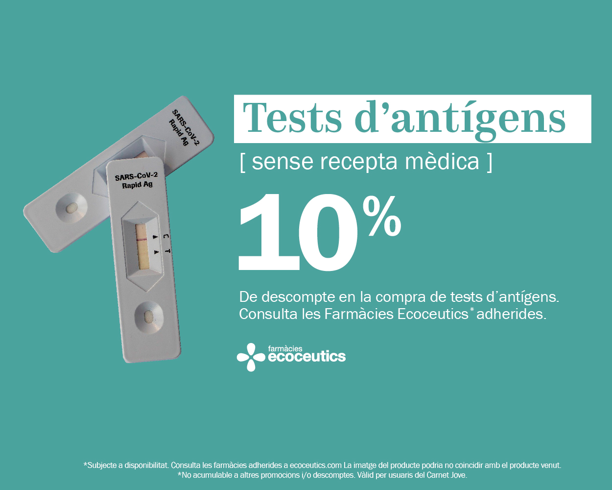 Per cuidar la salut com cal, aprofita els avantatges del Carnet Jove a Ecoceutics amb un 10% de descompte en la compra de tests d'antígens (una unitat o paquet de cinc unitats). Ara que fa fred, revisa't adequadament i surt de dubtes!