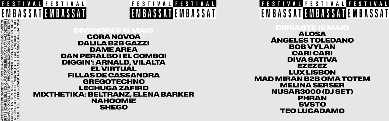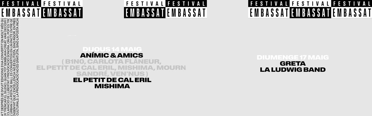 L’Embassa’t, festival de música independent del Vallès que se celebra anualment des de 2009 a Sabadell (Barcelona), celebra la seva divuitena edició el 14, 15, 16 i 17 de maig. El festival ha esdevingut un punt de trobada imprescindible pels amants del pop-rock, la música urbana i l’electrònica en directe. Aquest any podrem viure en directe grups com Alosa, Ángeles Toledano, Bob Vylan, Cari Cari, Dan Peralbo i el Comboi, El Petit de Cal Eril, El Virtual, Fillas de Cassandra, Gregotechno, Greta, La Ludwig Band, Mishima, Nusar3000, Shego, Svsto, Teo Lucadamo entre d’altres.